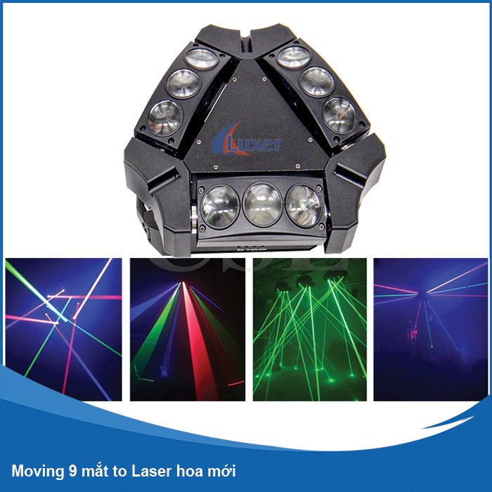 Moving 9 mắt to Laser hoa mới sử dụng nguồn sáng 9x10w bóng led RGBW siêu sáng khi chạy đèn tạo ra 9 luồng sáng đổi màu làm cho không gian sân khấu thêm phần náo nhiệt và sôi động.
